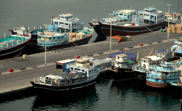 Traditional trading boats docked on the Deira harbour along Dubai Creek.